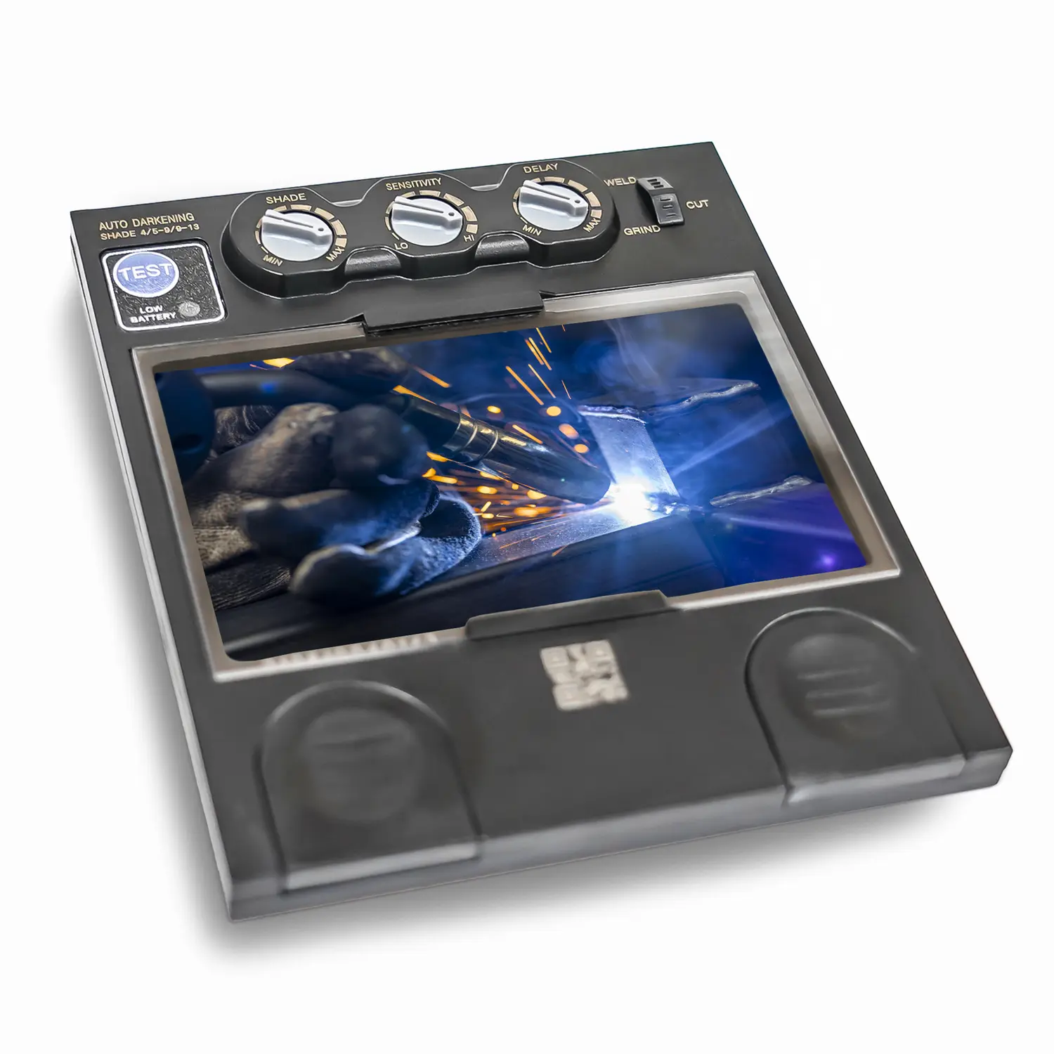 > Extern auf dem Schweisserhelm können Sie die Regelung der Helligkeit (DIN Stufen 9-13) bestimmen, mit dieser passen Sie sich den Lichtbedingungen (dunkel/hell) komplett an.